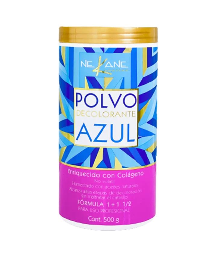 El polvo decolorante azul Nekane Capilar es un producto de uso profesional diseñado para lograr altos niveles de aclarado mientras ayuda a proteger la hebra capilar gracias a sus ingredientes acondicionadores como el colágeno y el aceite de agua |